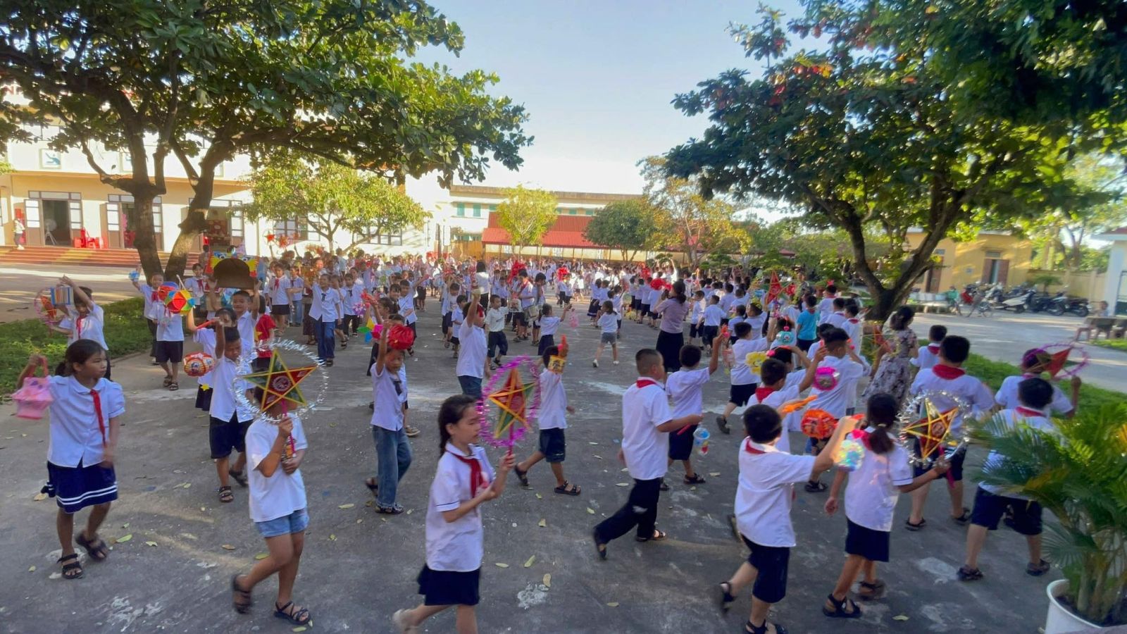 Kết thúc chương trình, các em được hòa mình trong đoàn rước đèn ông sao rực rỡ sắc màu. Ánh sáng lung linh của những chiếc đèn lồng hòa cùng tiếng trống múa lân rộn ràng đã làm cho sân trường như bừng sáng giữa đêm hội. Các em cùng nhau phá cỗ Trung thu trong không khí đầm ấm, nghĩa tình, khép lại một ngày hội tràn ngập niềm vui và những kỷ niệm đáng nhớ.